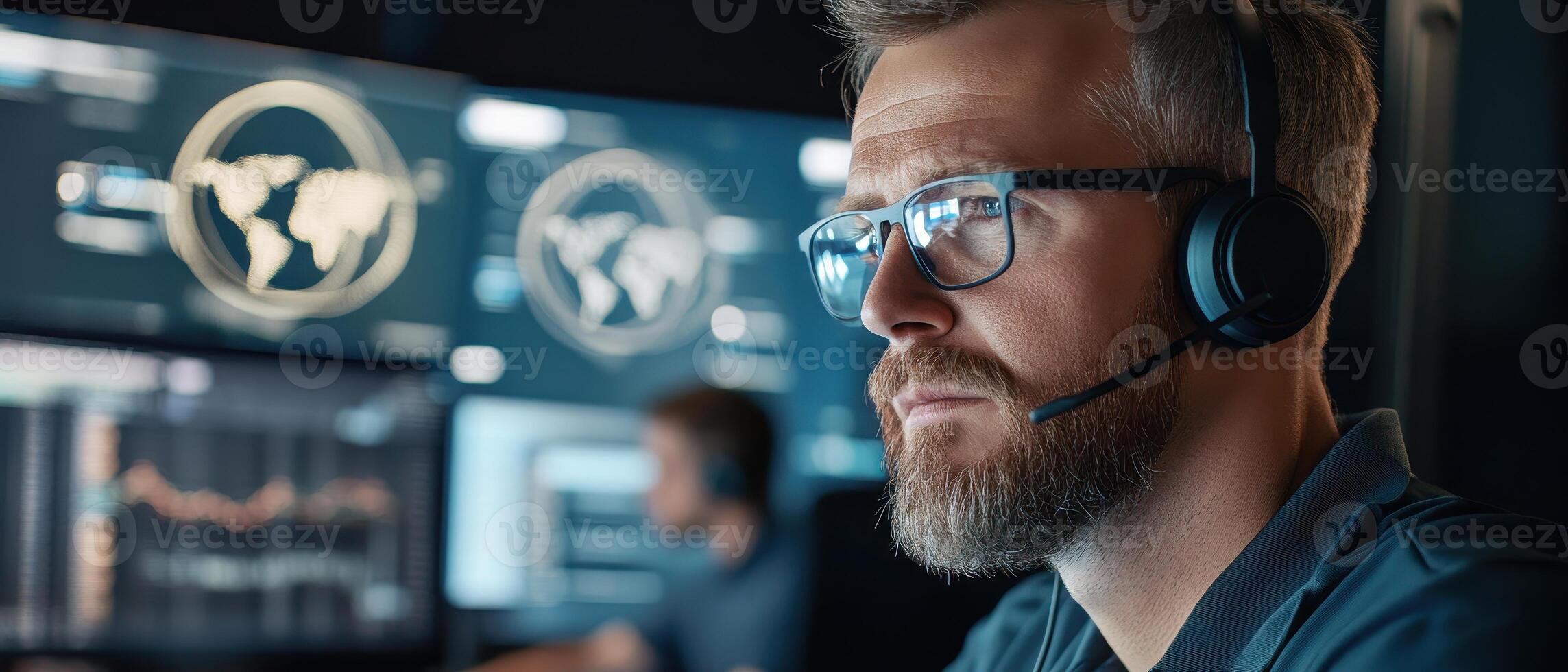 Smart Global Logistics Concept. A focused professional monitors data on screens, using a headset in a high-tech environment, emphasizing concentration and technology. Pro Photo