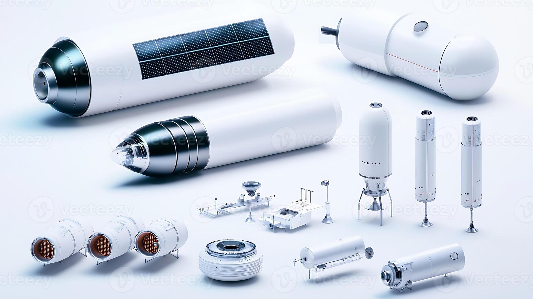 Various futuristic spacecraft models displayed on a clean surface with a minimalistic background Pro Photo