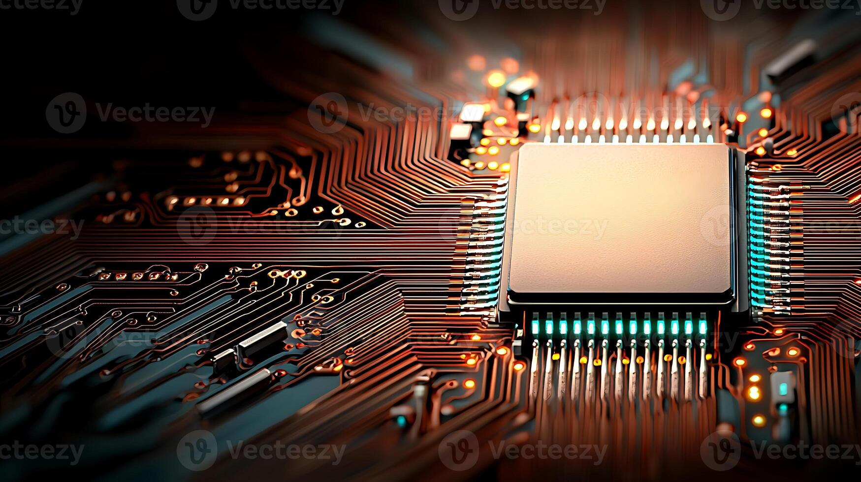 Close-up view of a microprocessor on a circuit board with intricate wiring and glowing elements Pro Photo