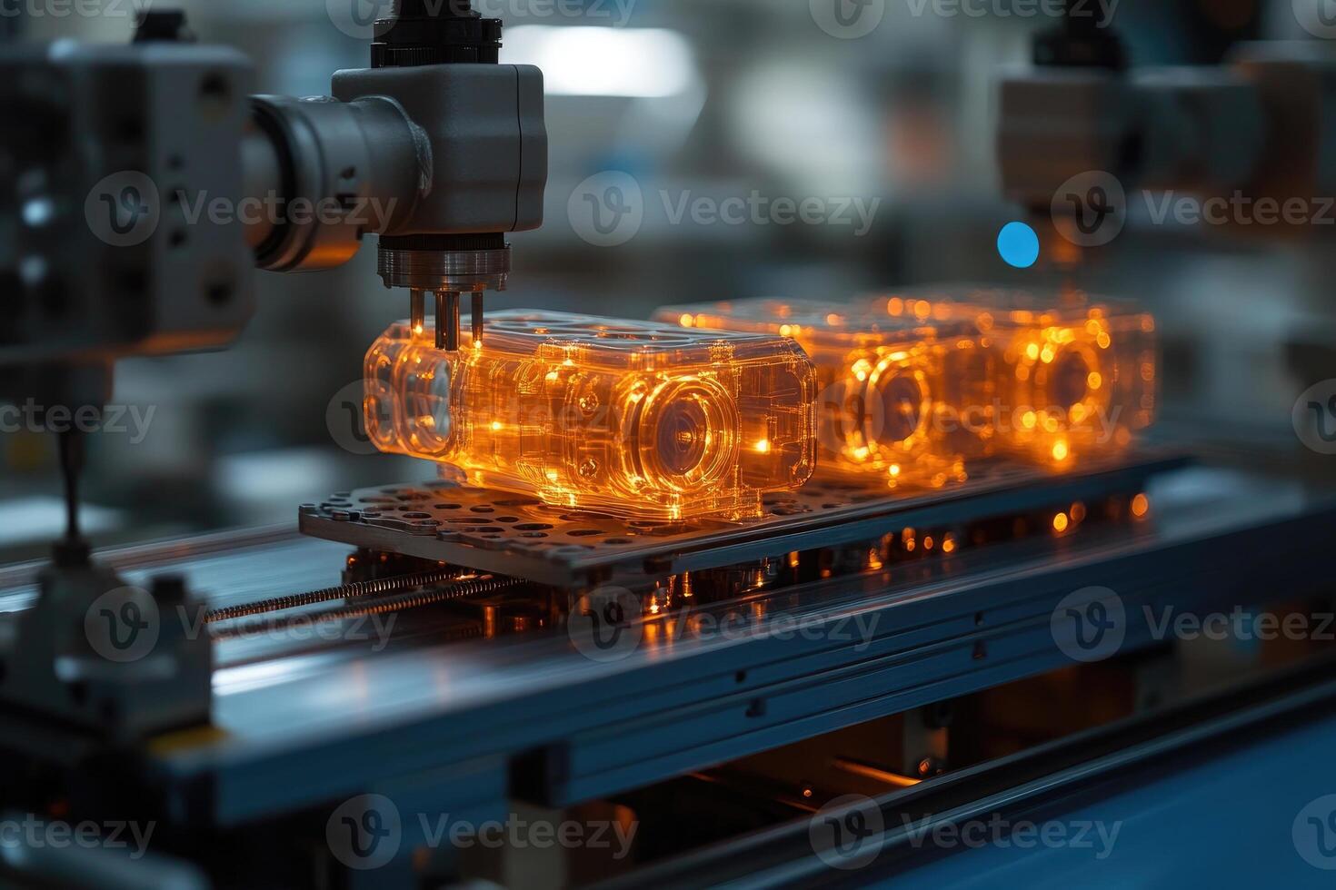 Robotic arm working on illuminated transparent objects in factory setting Pro Photo