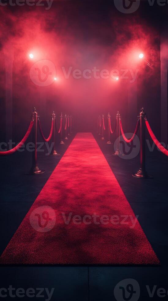 Elegant red carpet walkway illuminated by bright lights and shrouded in fog, creating a dramatic and inviting atmosphere Pro Photo