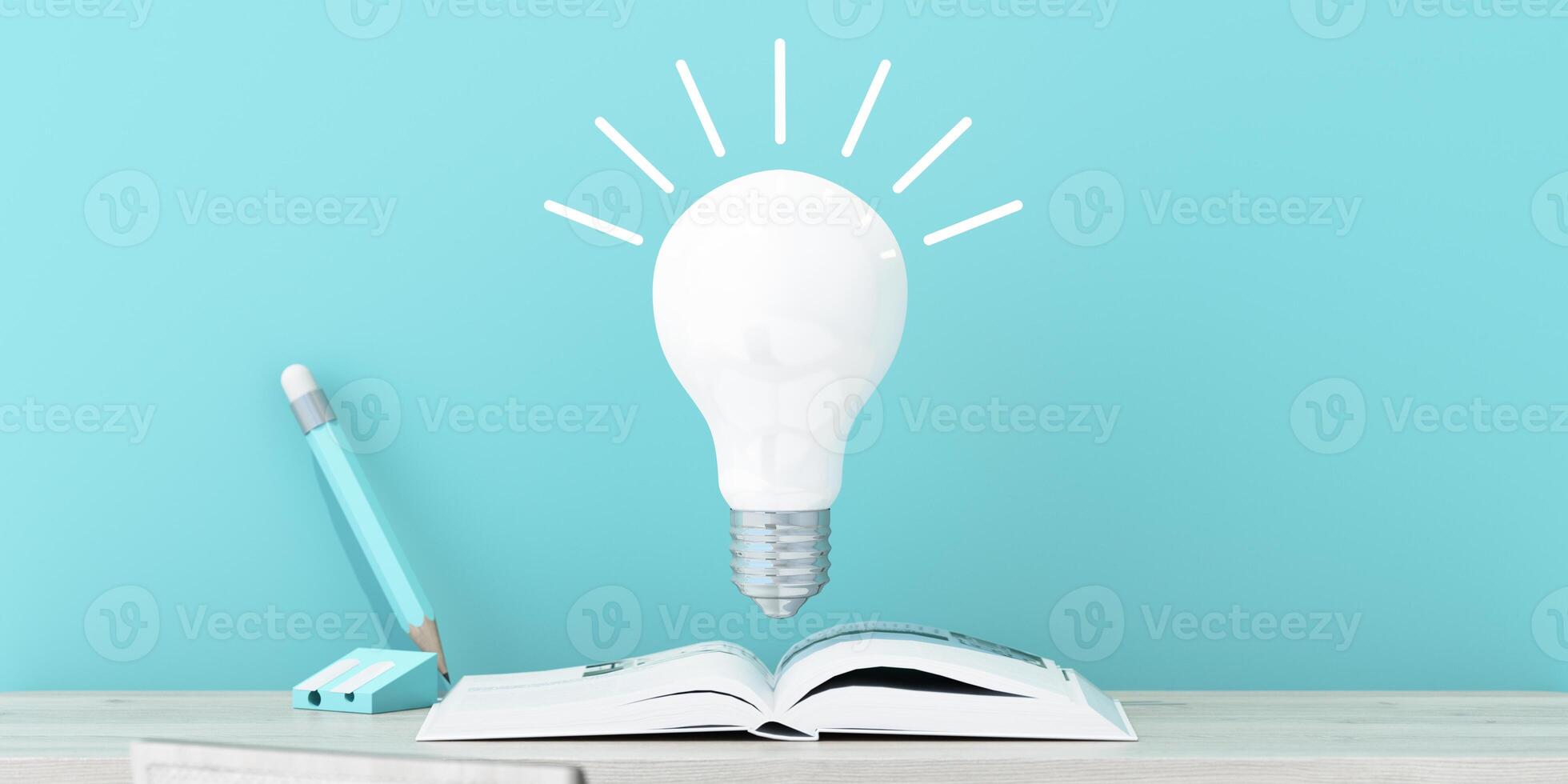 A floating glowing bulb above an open book with a pencil beside, symbolizing knowledge and creative thinking in a minimal study setup. 3d rendering. Pro Photo