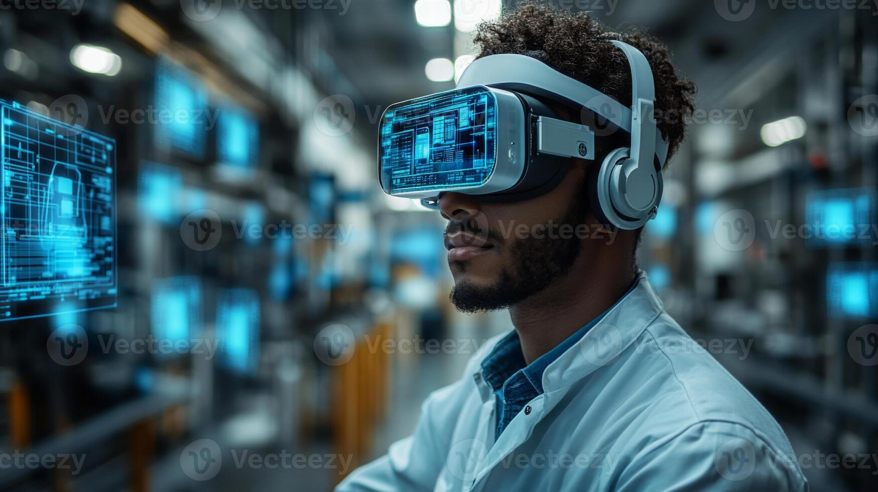 A professional wearing virtual reality gear is immersed in digital simulations, optimizing manufacturing processes in a high-tech factory focused on automation and engineering. Pro Photo