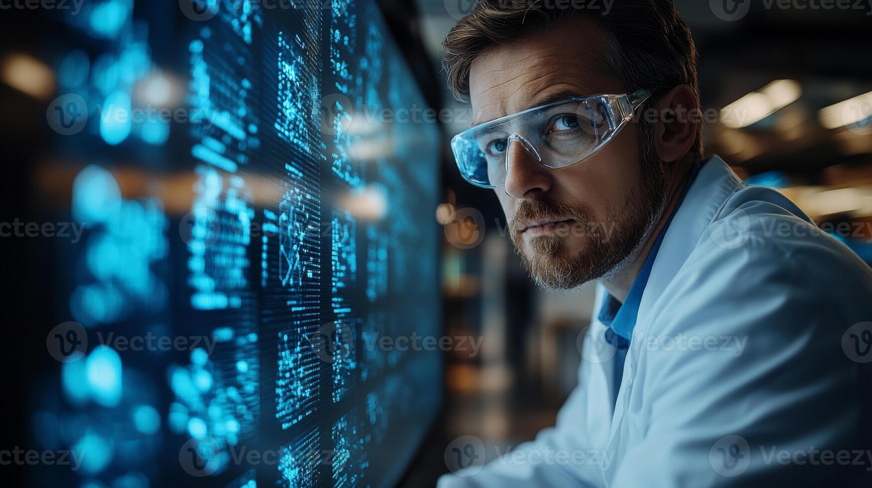 A scientist wearing protective eyewear studies quantum mechanics principles on a digital interface, observing data on qubits, superposition, and entanglement in a research setting. Pro Photo