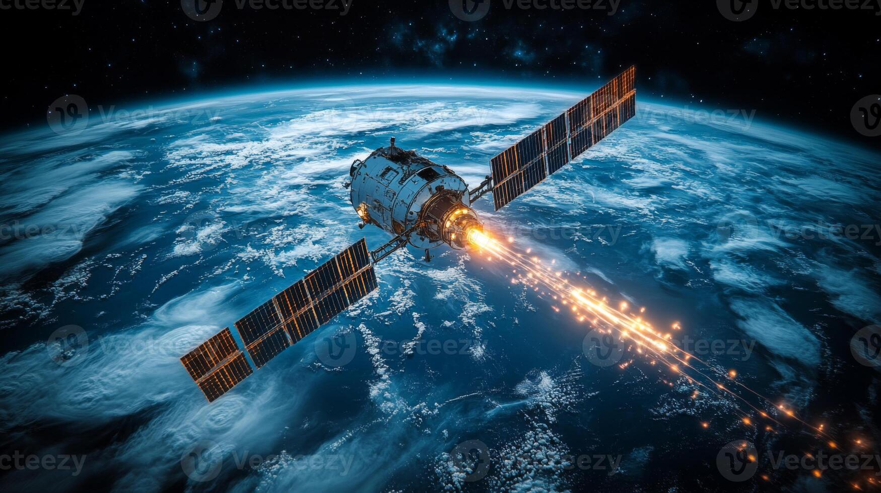 A satellite orbits Earth, actively transmitting signals for telemetry and positioning. It utilizes advanced technology for real-time tracking and GPS functionality in the vast expanse of space. Pro Photo