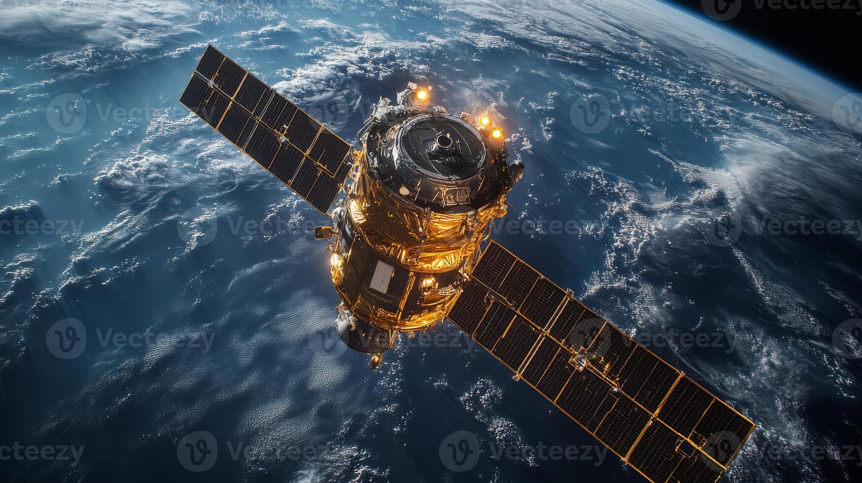A satellite orbits Earth, using solar panels for power while transmitting critical telemetry data to support global positioning and tracking systems, showcasing advanced technology. Pro Photo