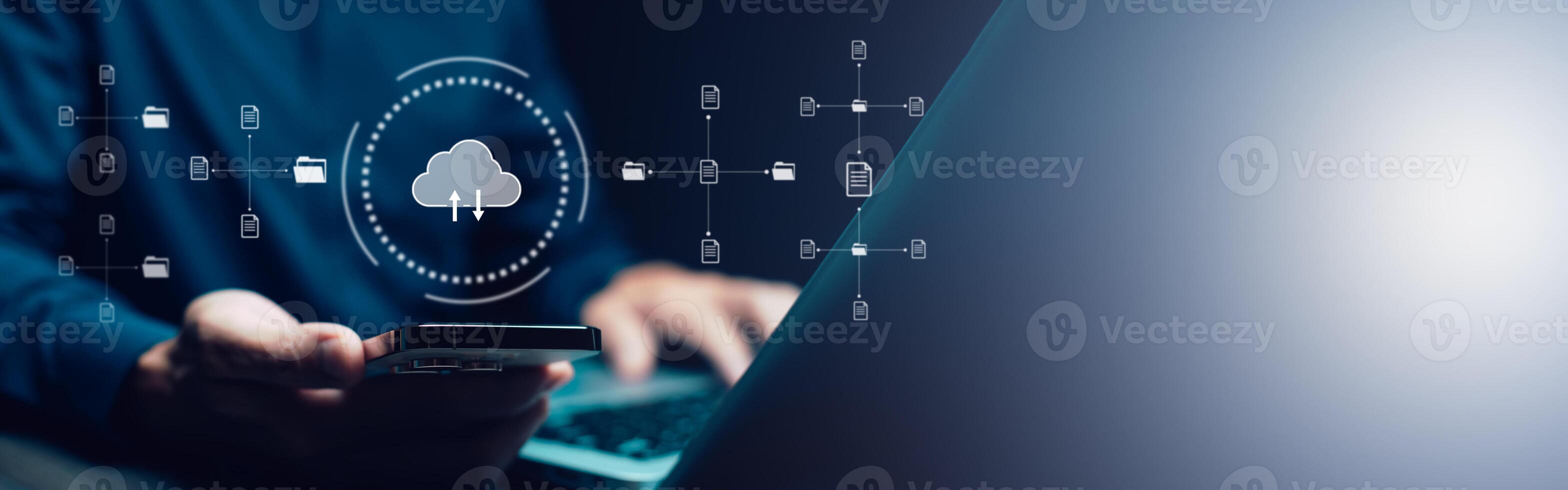 Cloud technology concept Global network of metaverse systems concept, Man hand touch data with internet cloud technology and File Transfer backup copy,Global business Internet for Telecommunication. Pro Photo
