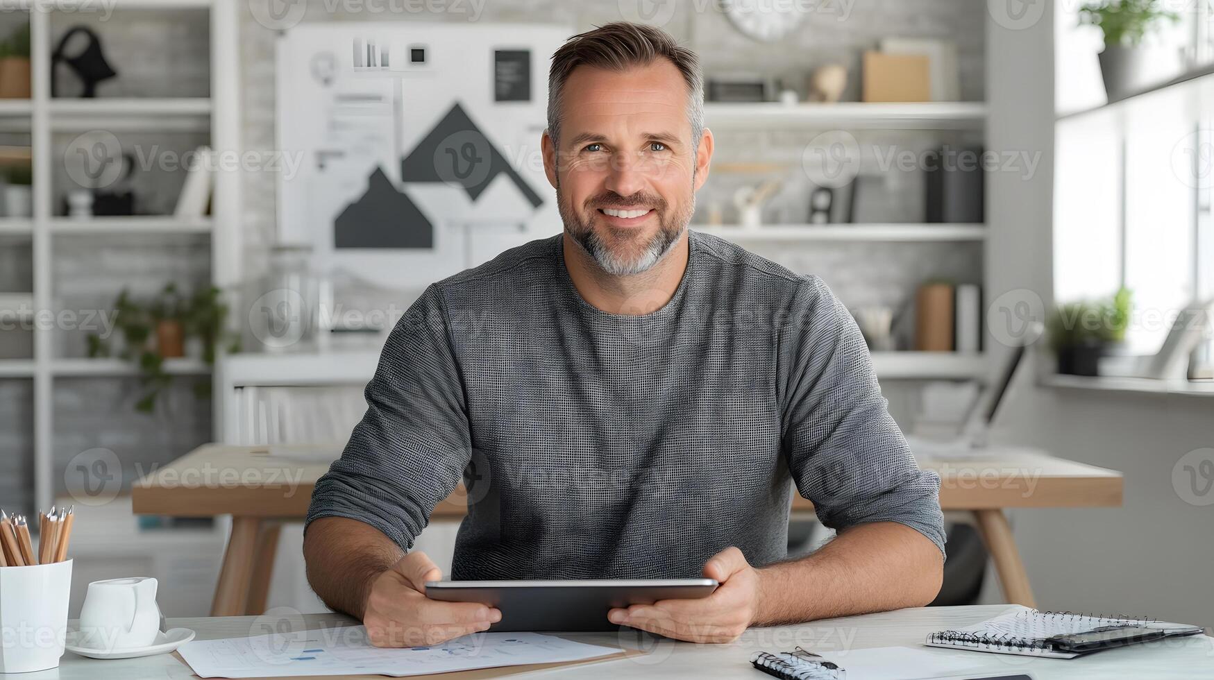 A small business owner working alone at a desk, sketching business plans on a tablet while surrounded by charts and graphs Pro Photo
