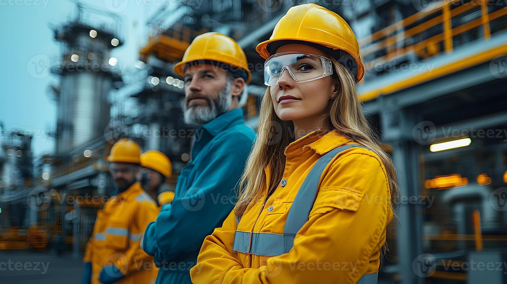 Factory operators interacting with touchscreens displaying AI performance analytics Pro Photo