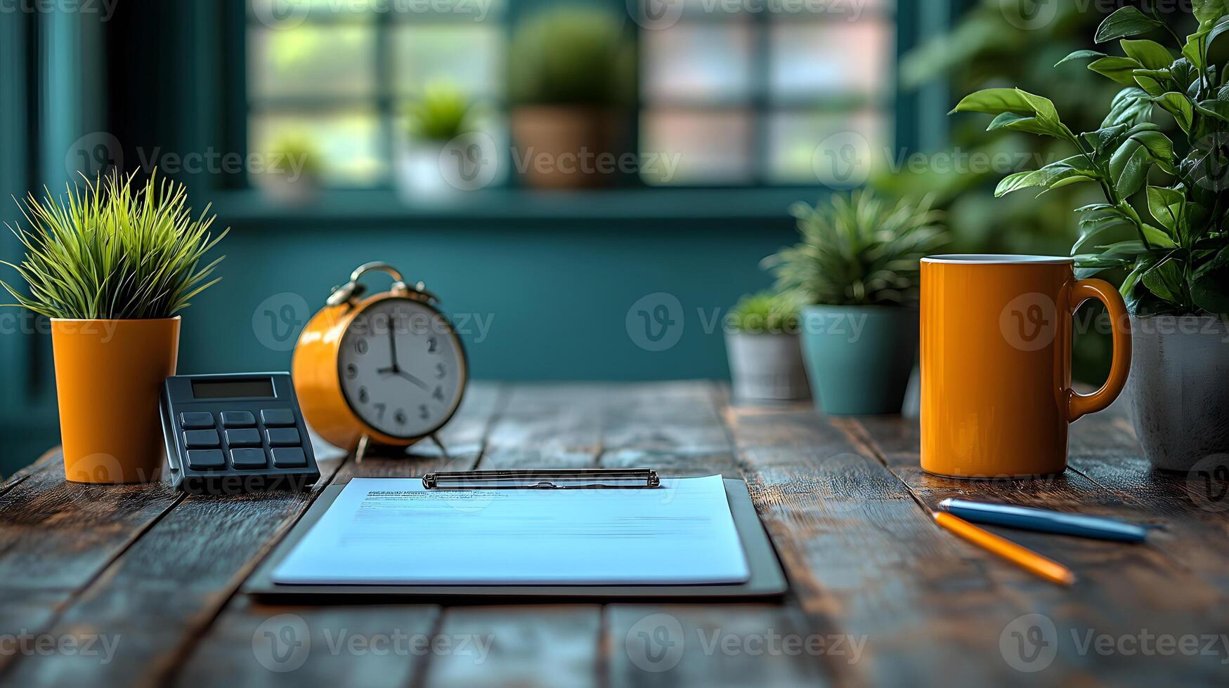 Organized office desk setup showing computer clipboard clock calculator coffee mug data graph background 8K realistic Pro Photo