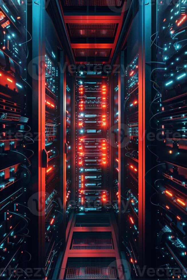 Futuristic data center with rows of servers illuminated by red and blue lights. The perspective creates a tunnel effect, emphasizing the depth of the server racks. Pro Photo