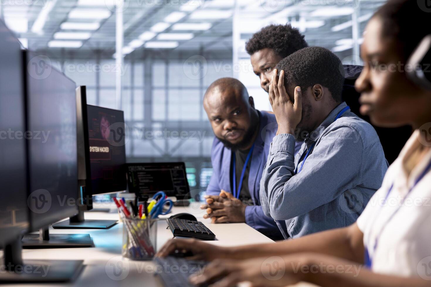 Team of programmers in server farm upset after losing all data after hacker managed to pass firewall. Critical error alert on monitor in data center making IT staff members feel dejected Pro Photo