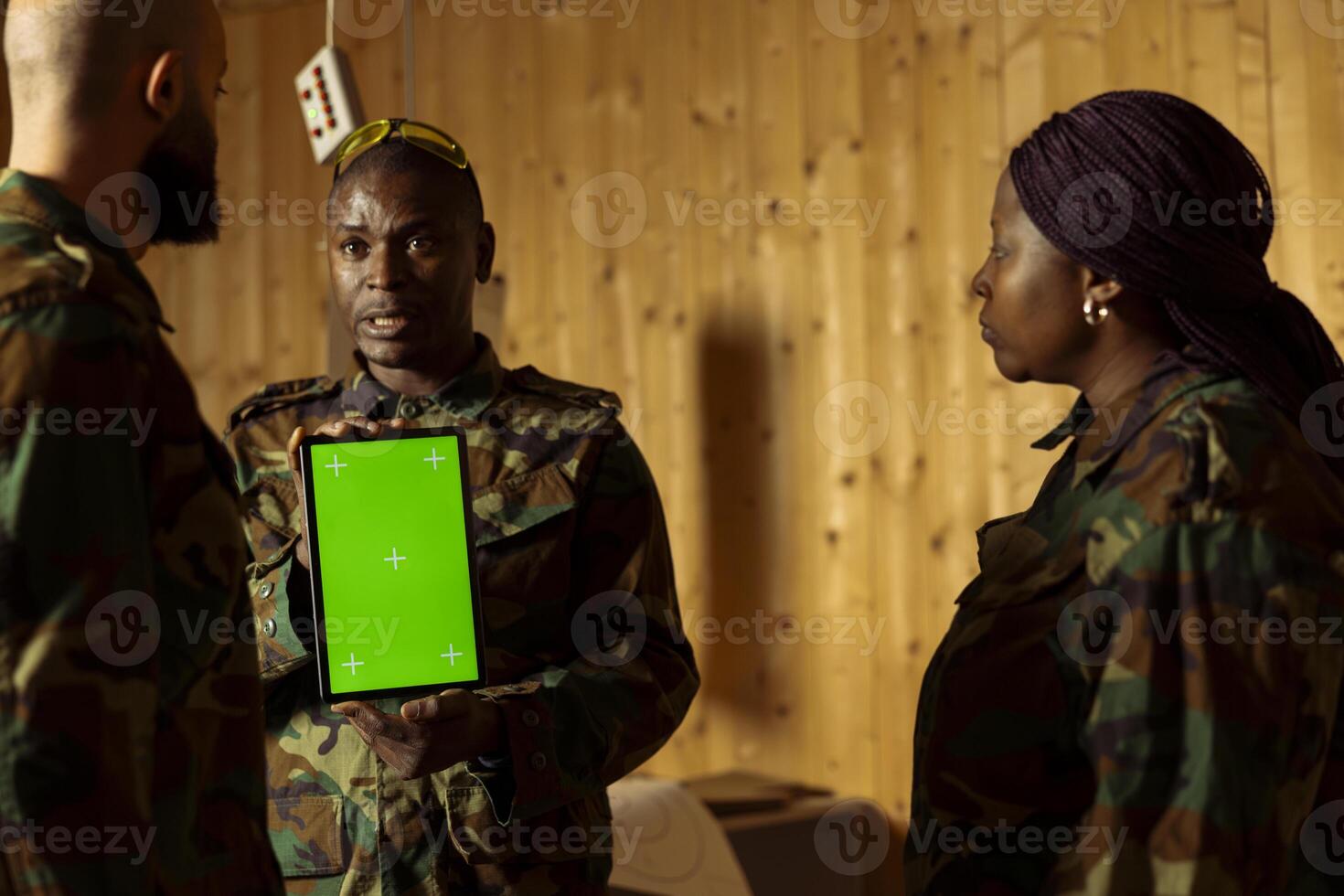 Soldiers at shooting gallery watching on mockup tablet, participating in marksmanship training program. Military units looking at instructions on isolated screen device during shooting course Pro Photo