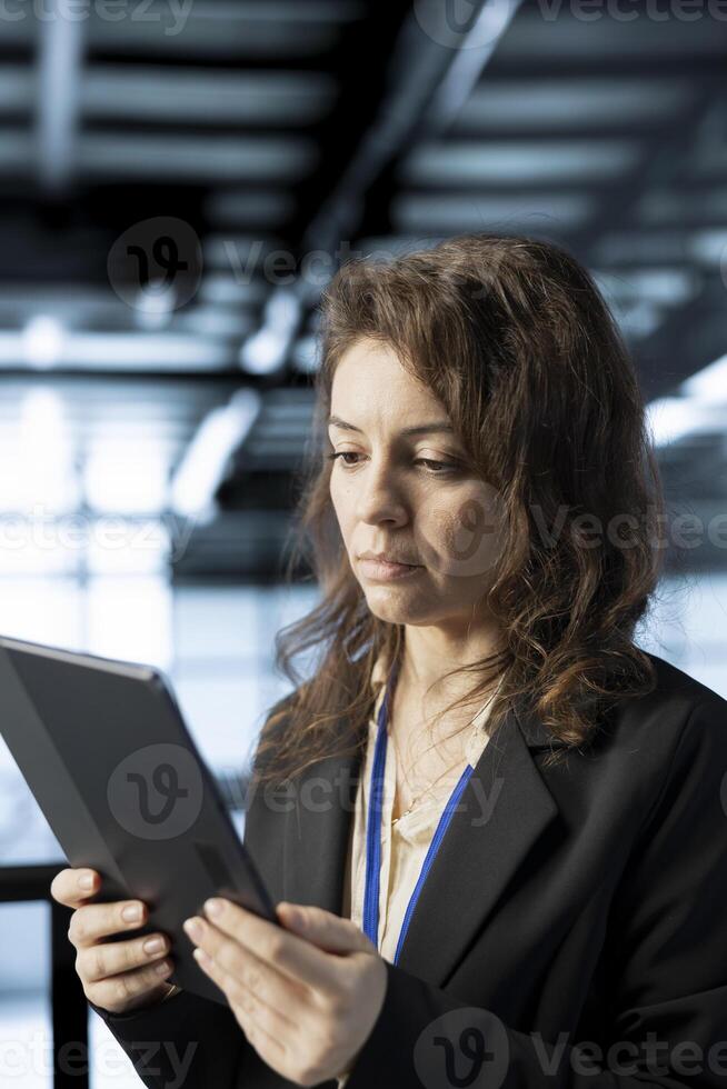 Woman in data center operating tablet, analyzing metrics, optimizing storage volumes, reviewing network paths, validating virtualization settings, ensuring seamless operations Pro Photo