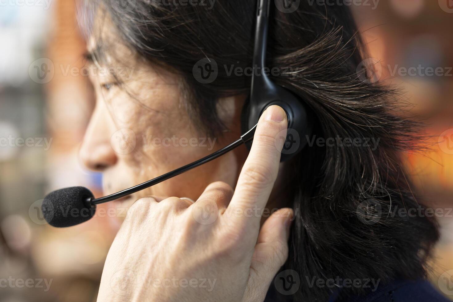 Call center staff member using headphones mic to answer technical inquiries about hardware issues. Knowledgeable Asian worker doing customer support job using PC to troubleshoot problems, close up Pro Photo