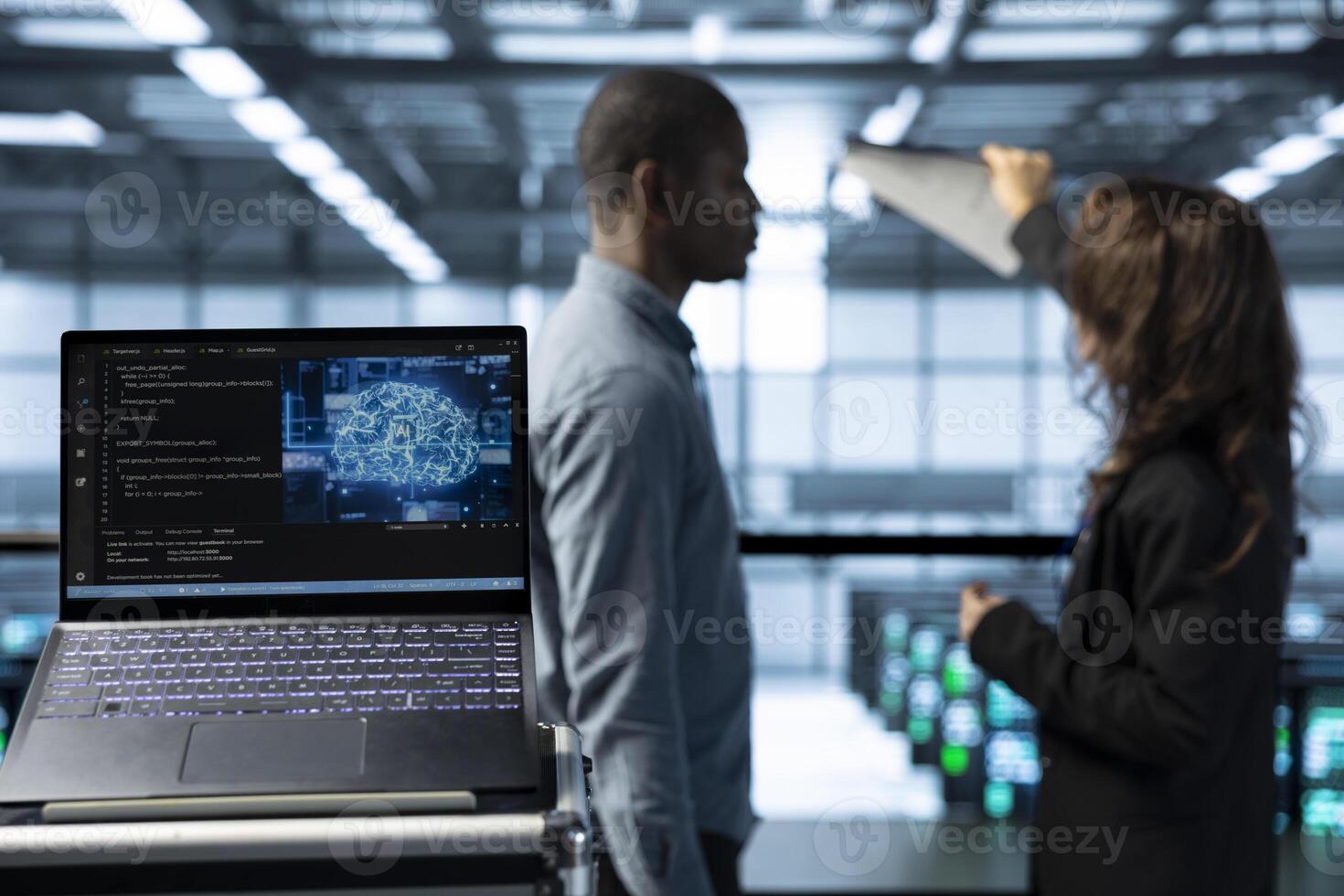 Laptop in front of data center engineers in blurry background deploying artificial intelligence tools. Close up of AI coding on notebook screen next to technicians inspecting server clusters Pro Photo