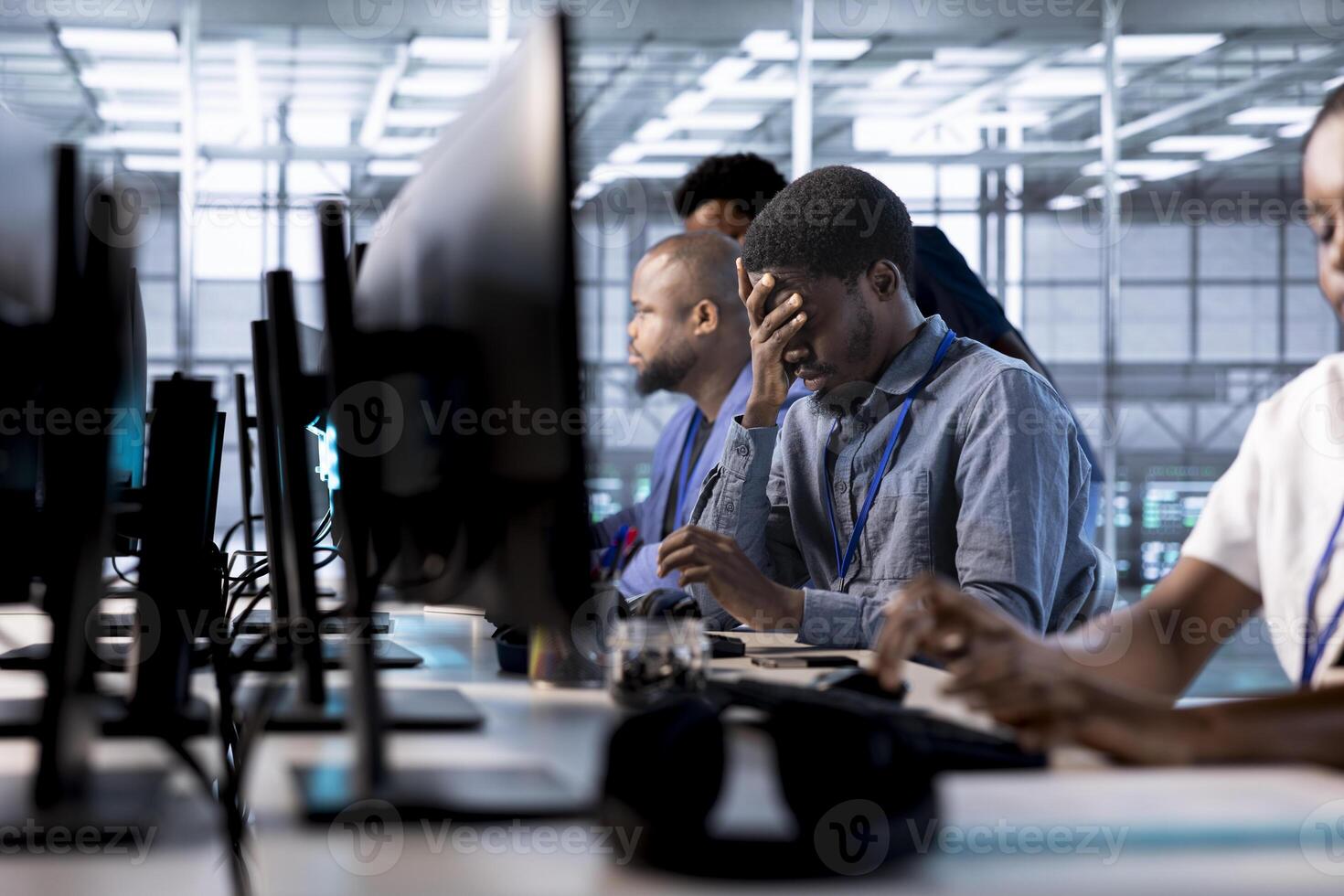 Tired engineer feeling headache while reconfiguring server farm to optimize it for data processing requirements. Stressed man working overtime to ensure data center gear operates efficiently Pro Photo