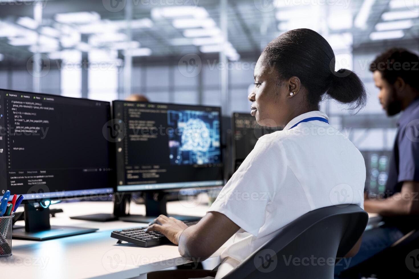 Server farm IT expert doing AI research, creating and implementing algorithms using neural networks. African american woman in data center using artificial intelligence computational models Pro Photo