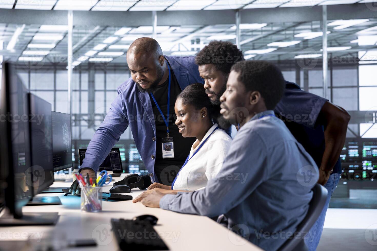 Group of technicians doing brainstorming, reconfiguring server farm to optimize it for data processing requirements. Employees working together to ensure data center equipment operates efficiently Pro Photo