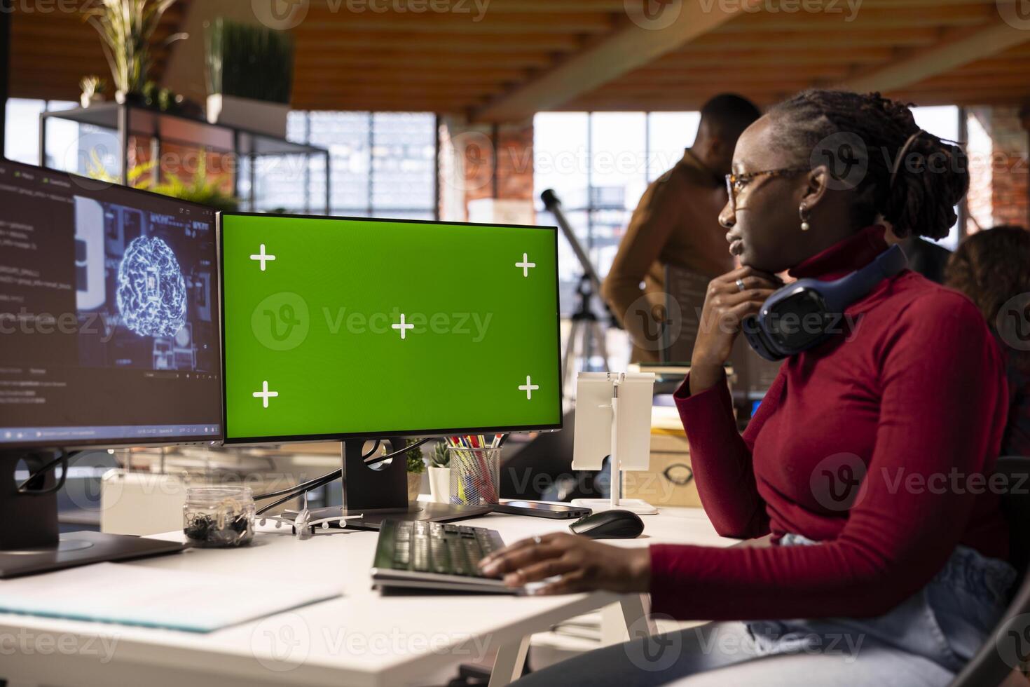 Engineer using chroma key computer to do maintenance on artificial intelligence neural networks. Tech startup IT expert using AI systems on mockup PC aiding in processing and transmitting information Pro Photo