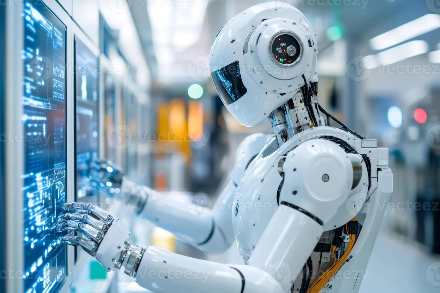 Advanced humanoid robot working with data on control panel in technological laboratory Pro Photo