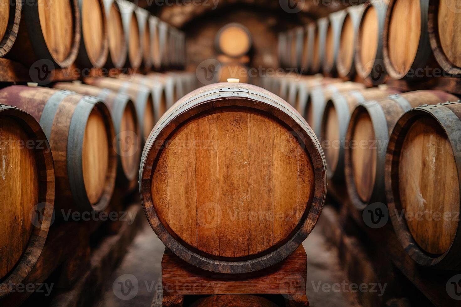 Wine barrel resting in cellar with rows of barrels during winemaking process Pro Photo