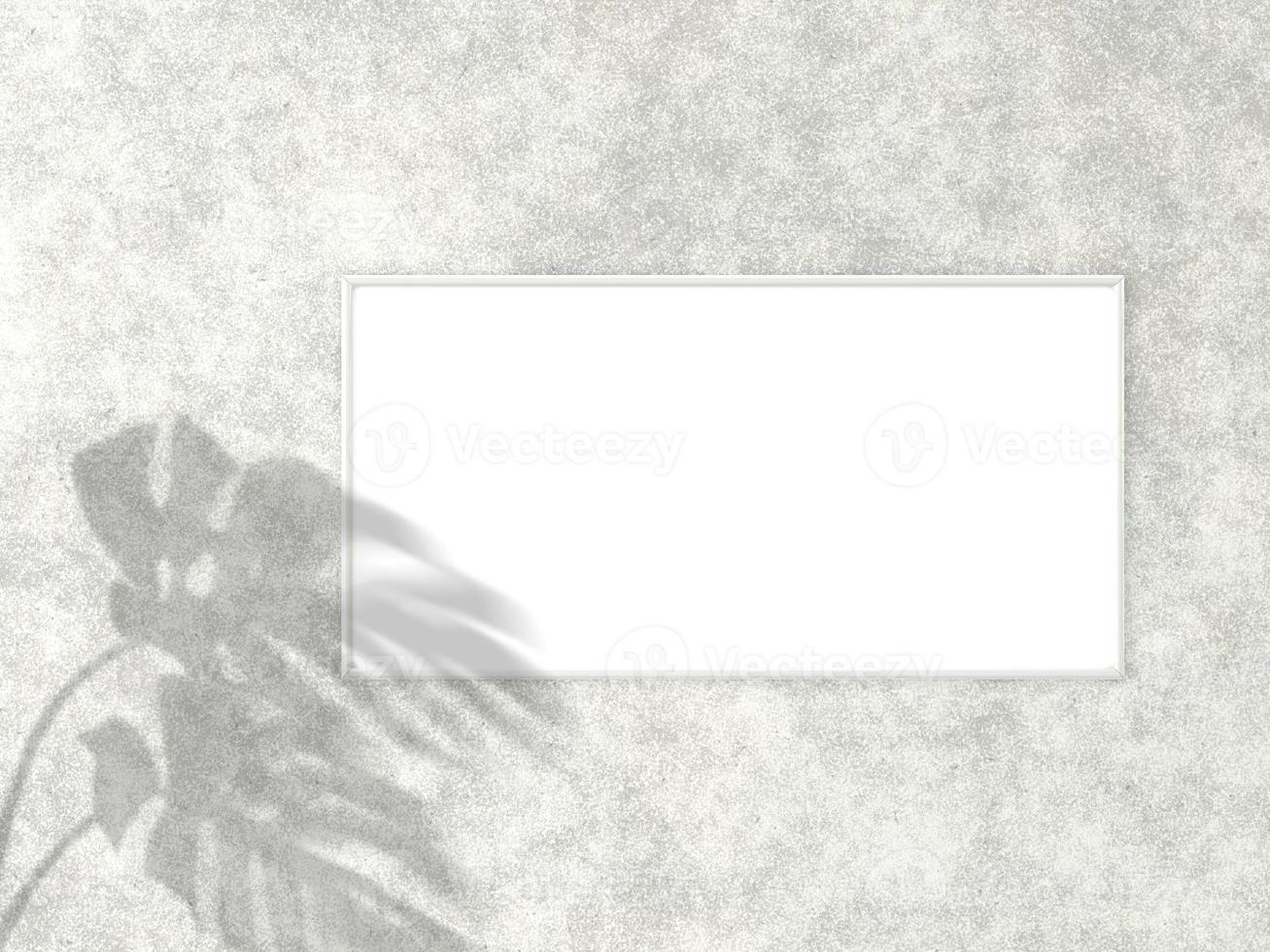 1x2 horizontal White frame for photo or picture mockup on concrete background with shadow of monstera leaves. 3D rendering. Pro Photo