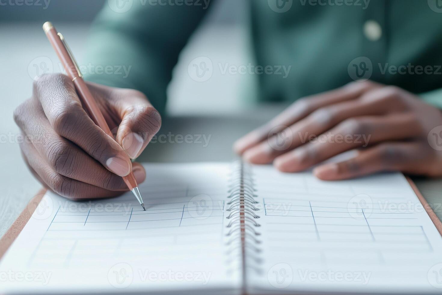 Management efficiency and goal-setting concept. A person writing in a notebook with a pen, focused on their task. Pro Photo