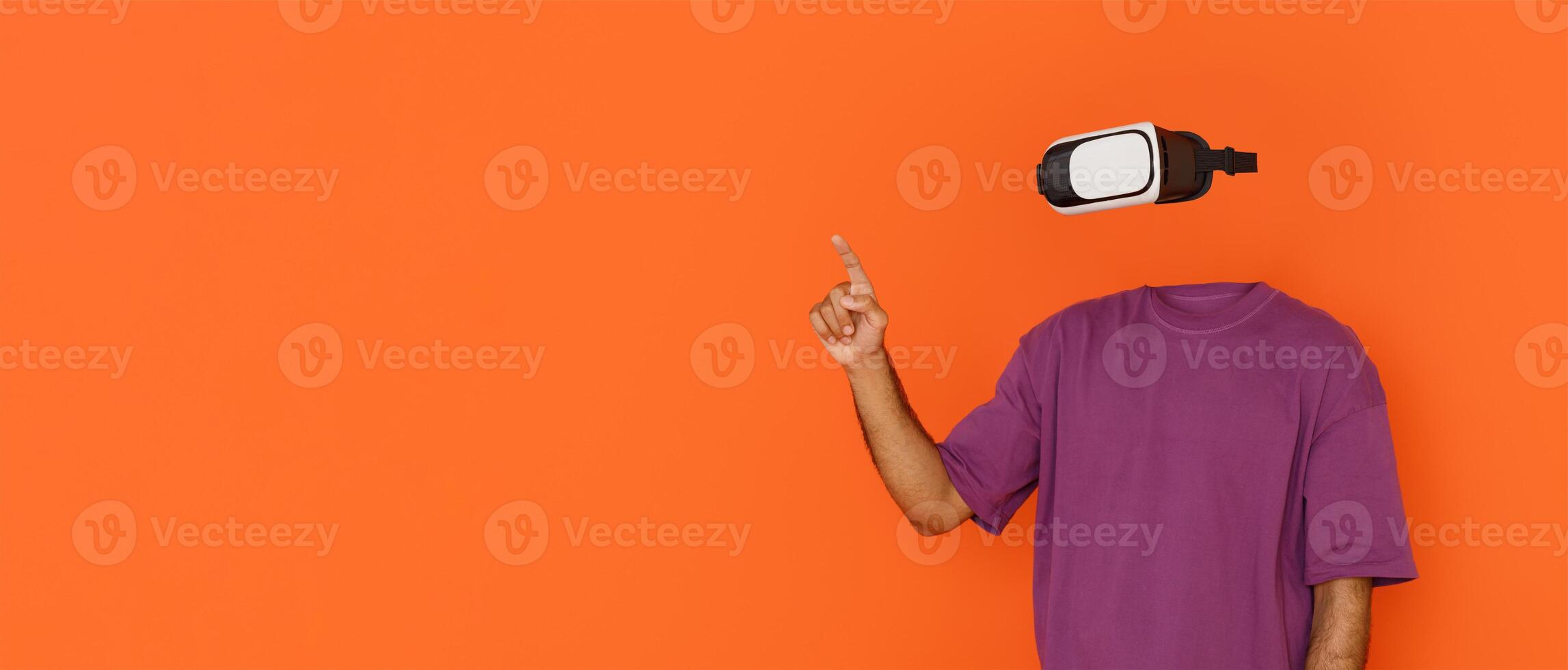 User explores virtual reality using modern goggles, gesturing as if interacting with digital elements. The vibrant orange background highlights the cutting-edge tech experience. Pro Photo
