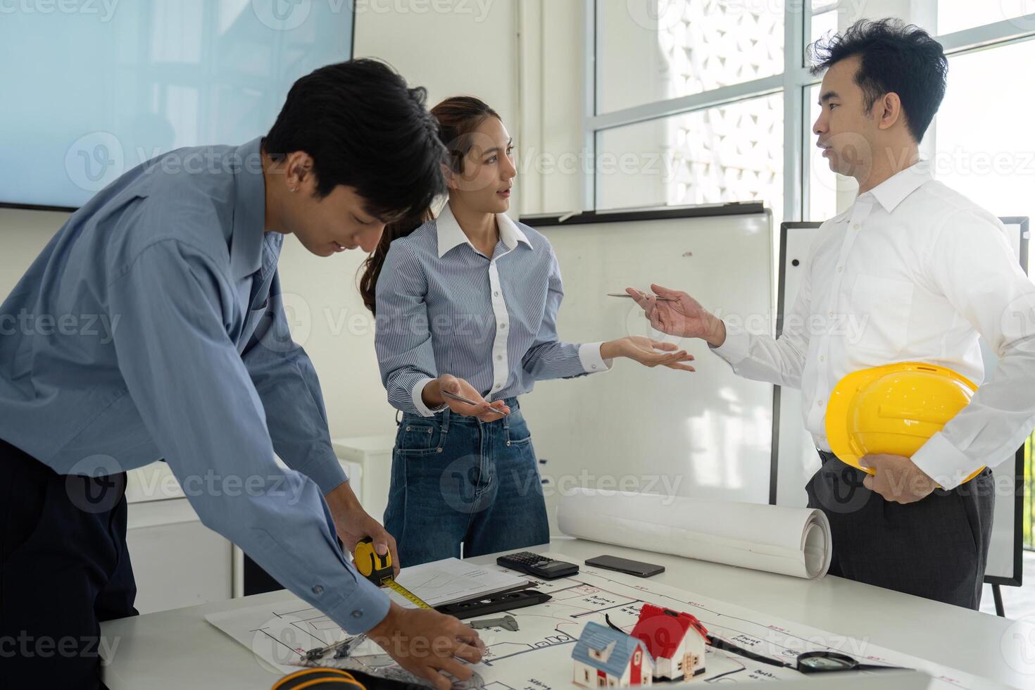 Communication and Design. A team engages in dialogue around an architectural plan, discussing features and creating solutions. Pro Photo