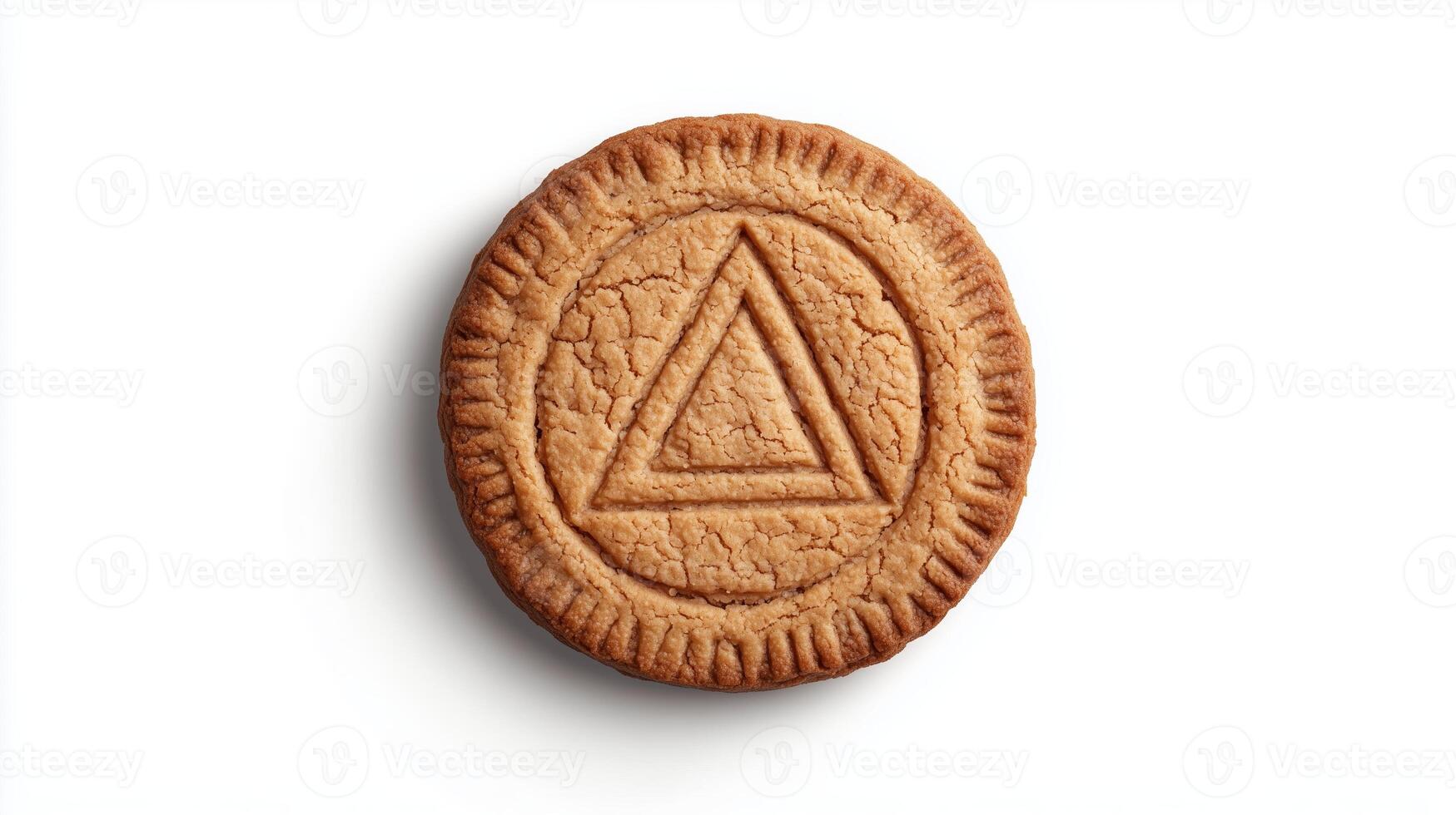 Circular cookie with the triangle simple icon on it, isolated on solid white background. 16 Pro Photo