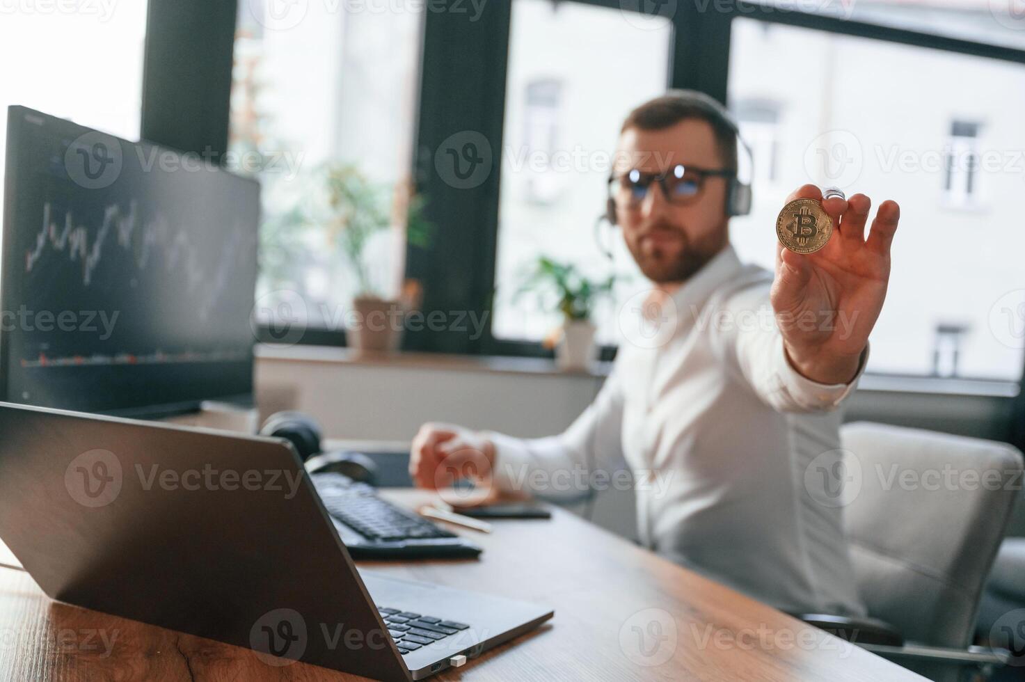 Sitting and showing physical bitcoin. Man in formal clothes is working in the modern office. Using computer Pro Photo