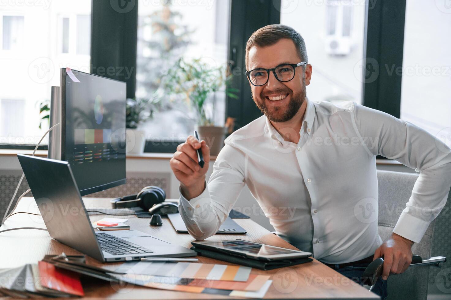Sitting and, smiling. Man in formal clothes is working in the modern office. Using computer Pro Photo