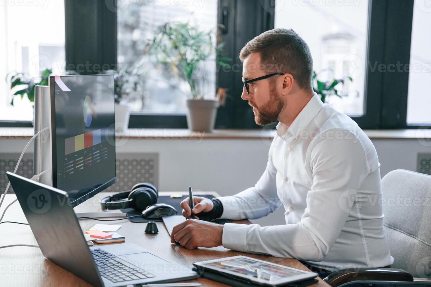 Side ,view. .Man in formal clothes is working in the modern office. Using computer Pro Photo