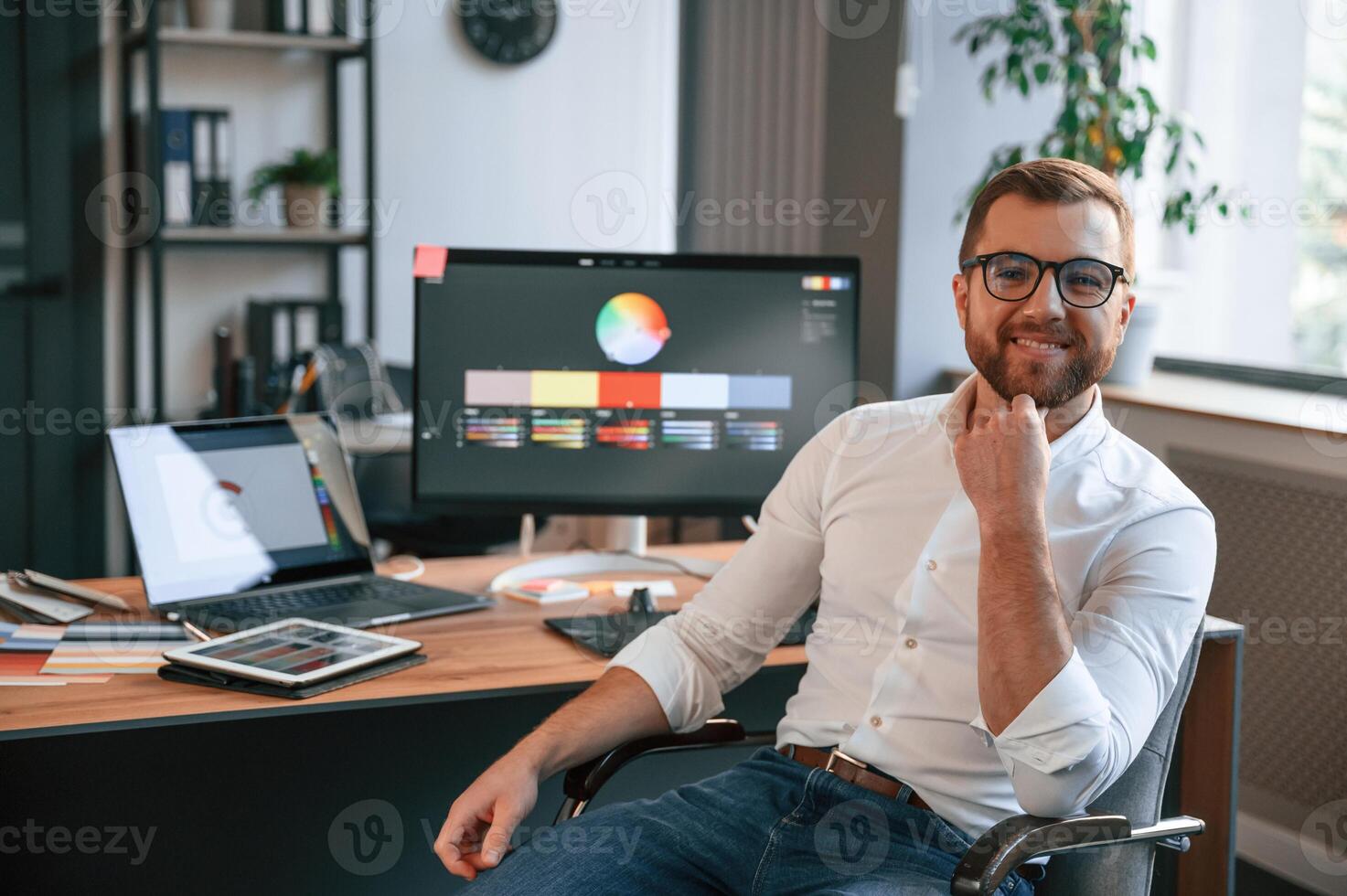 Sitting and smiling. Man in formal clothes is working in the modern office. Using computer Pro Photo
