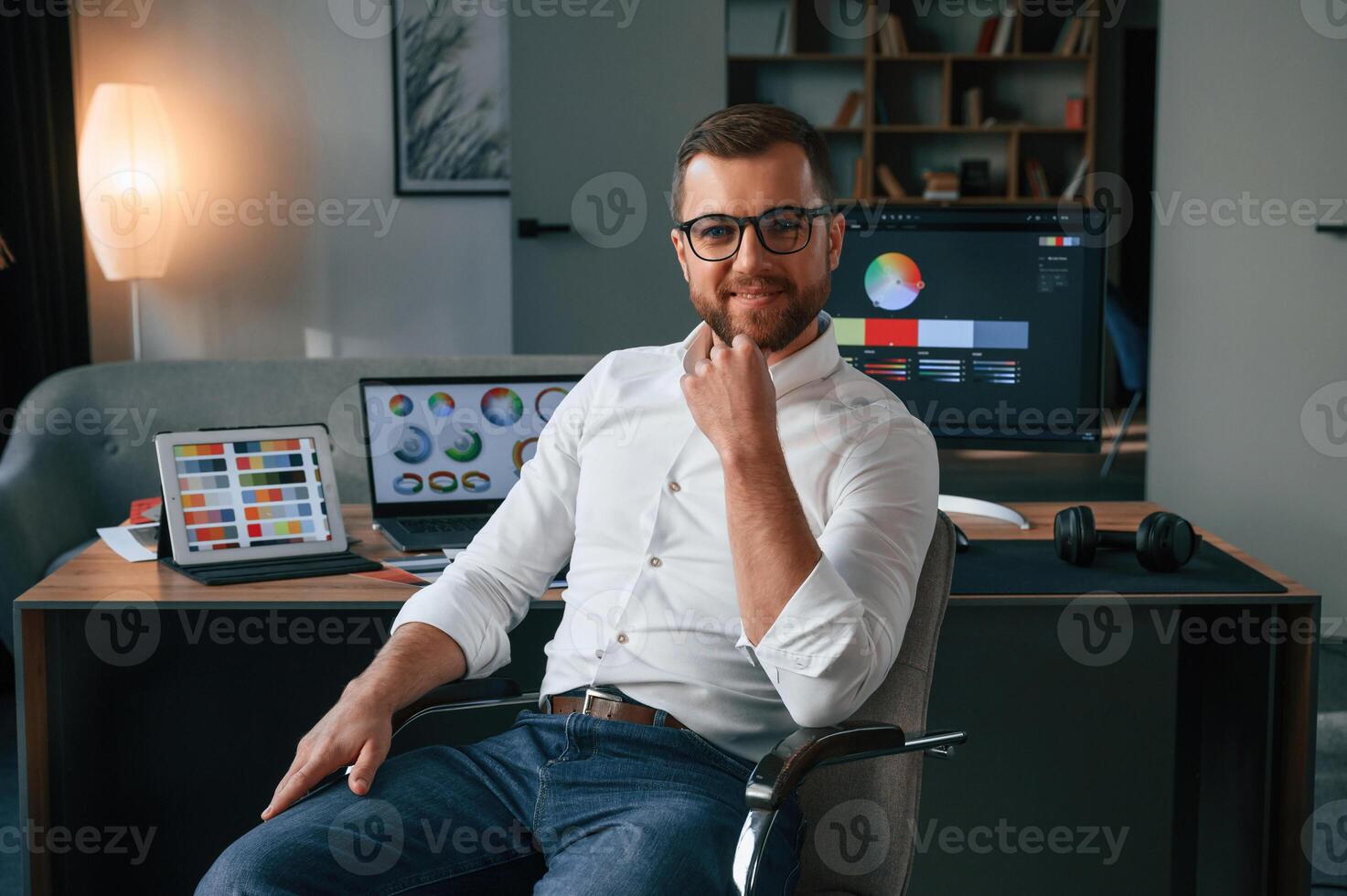 Man in formal clothes is working in the modern ,office. Using computer Pro Photo