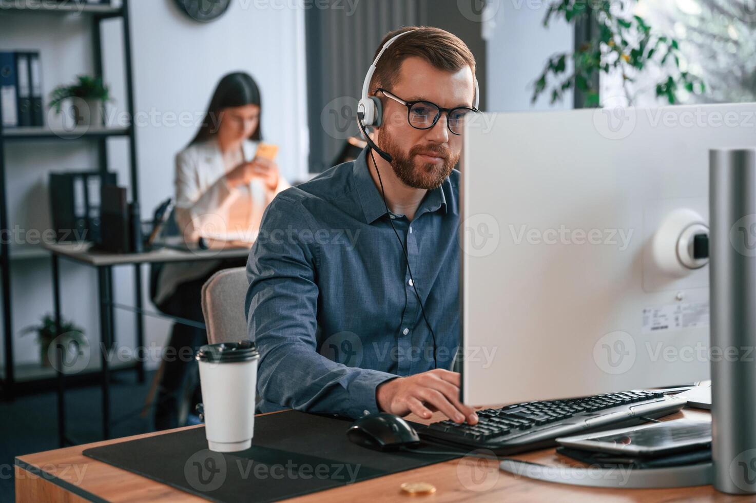 Man ,is using computer. Two employees are working together in the modern office Pro Photo