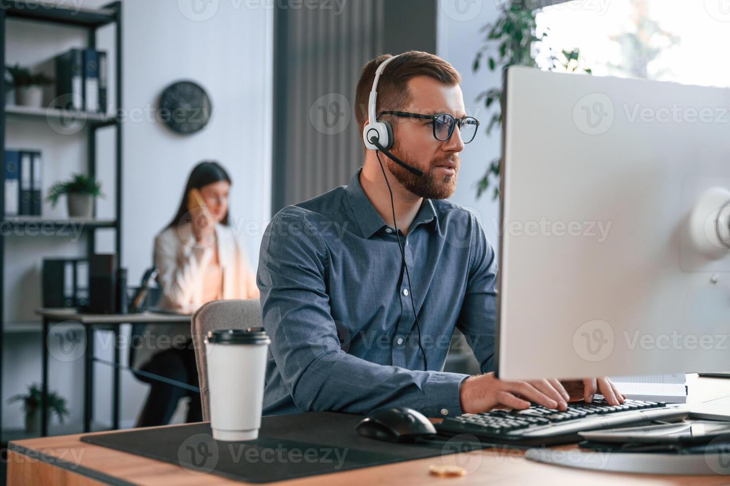 Man is using computer. Two employees are working together in the modern office Pro Photo