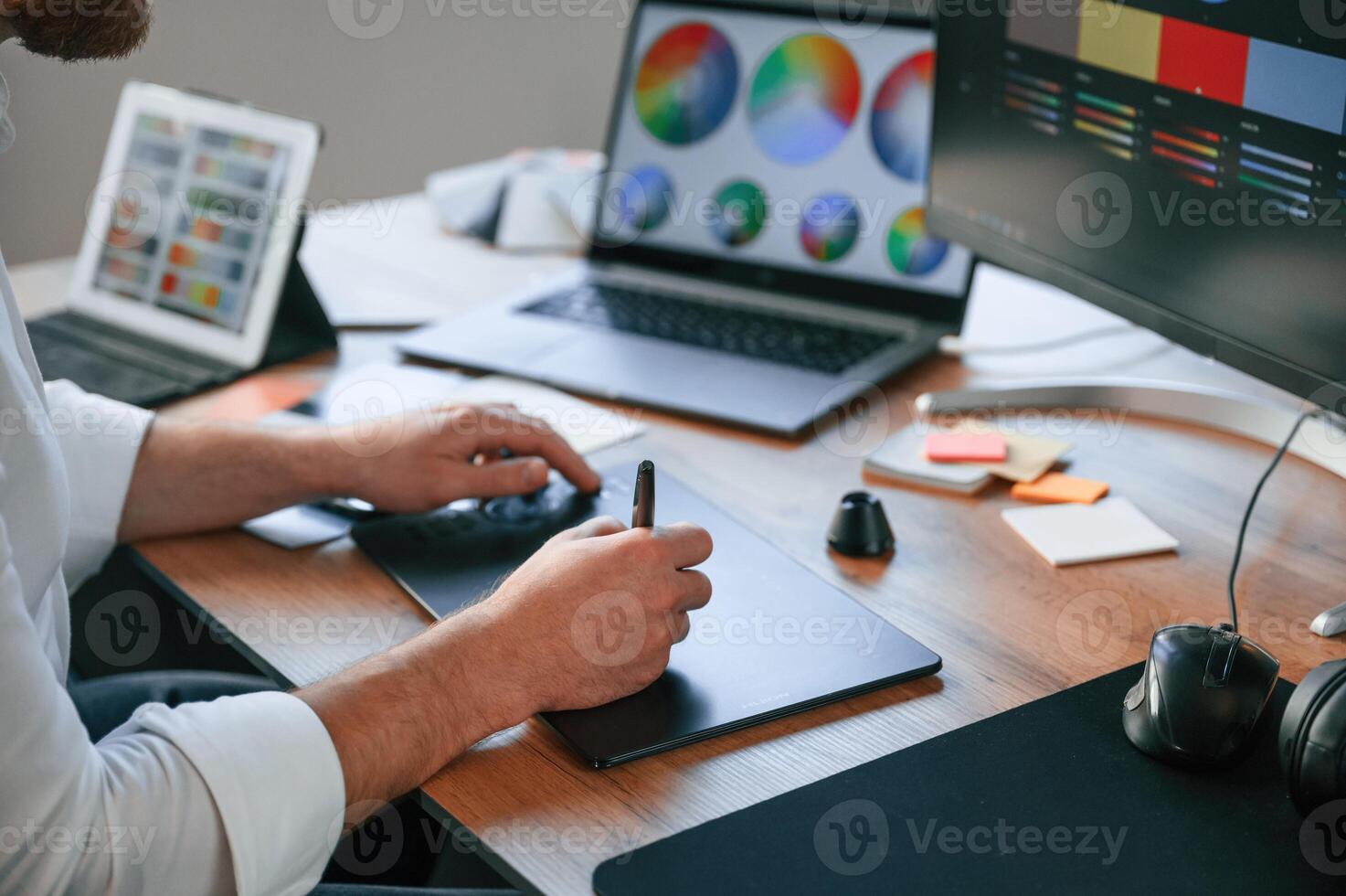 With graphic tablet. Close up view of designer's hands. Man in formal clothes is working in the modern office. Using computer Pro Photo
