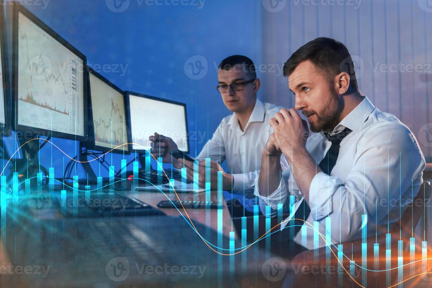 Graphs and data. Different information on screens. Two stock traders working in the office with exchange technology Pro Photo