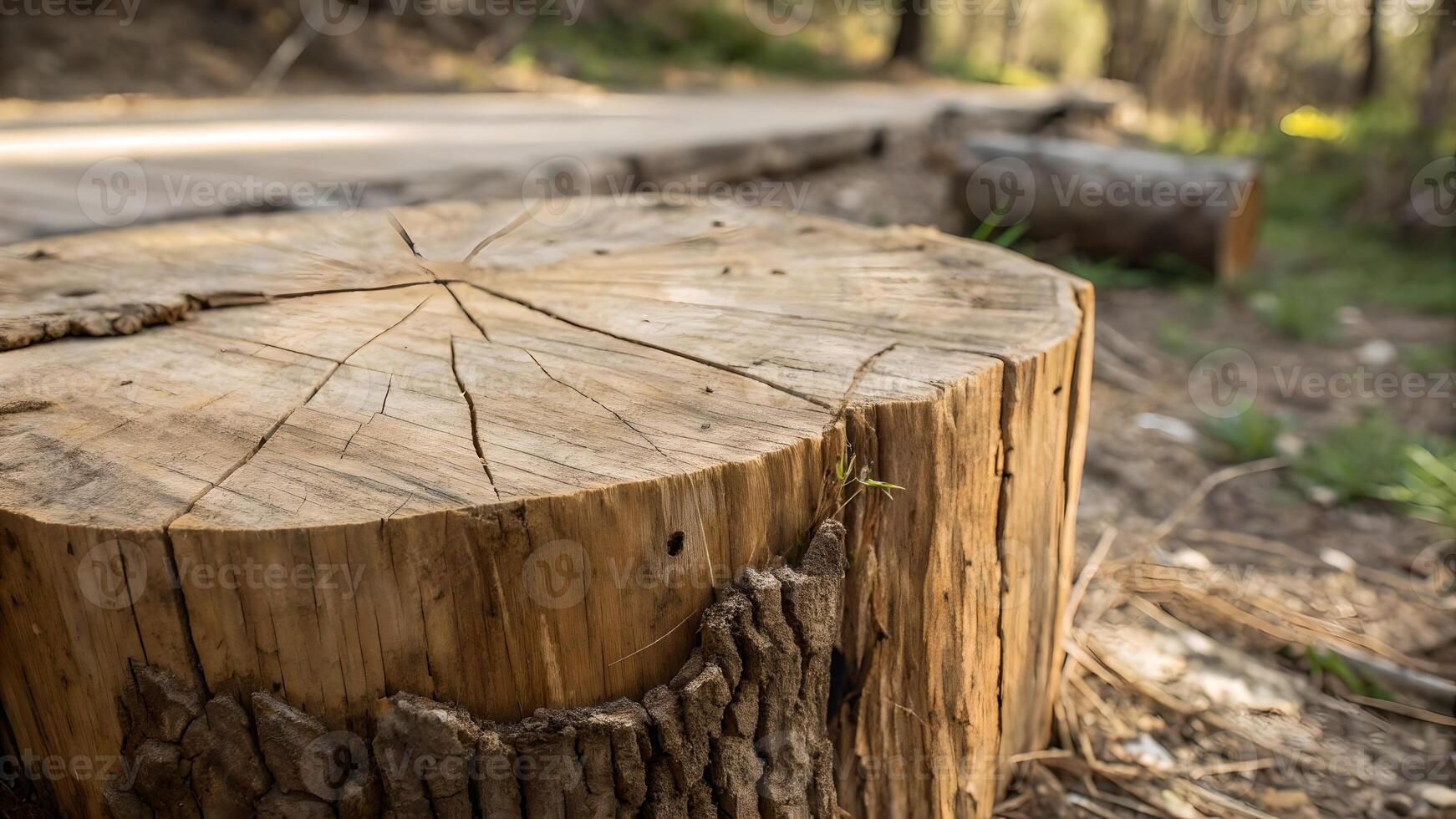 A close up of a weathered tree stump in a forest, showcasing its intricate rings and natural texture, with a wooden path and greenery in the background. Pro Photo