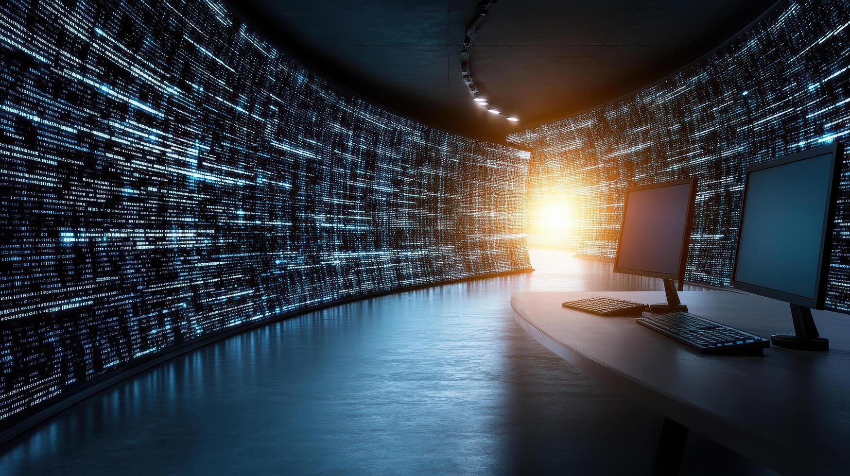 modern workspace with computers and digital data wall, illuminated by sunlight Free Photo