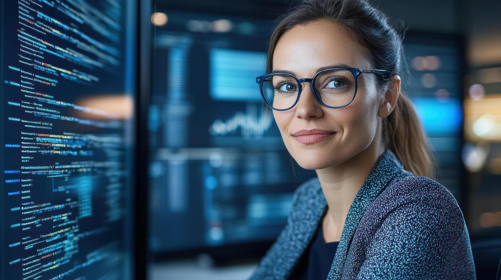 professional woman with glasses is analyzing data multiple screens filled with code and graphs photo