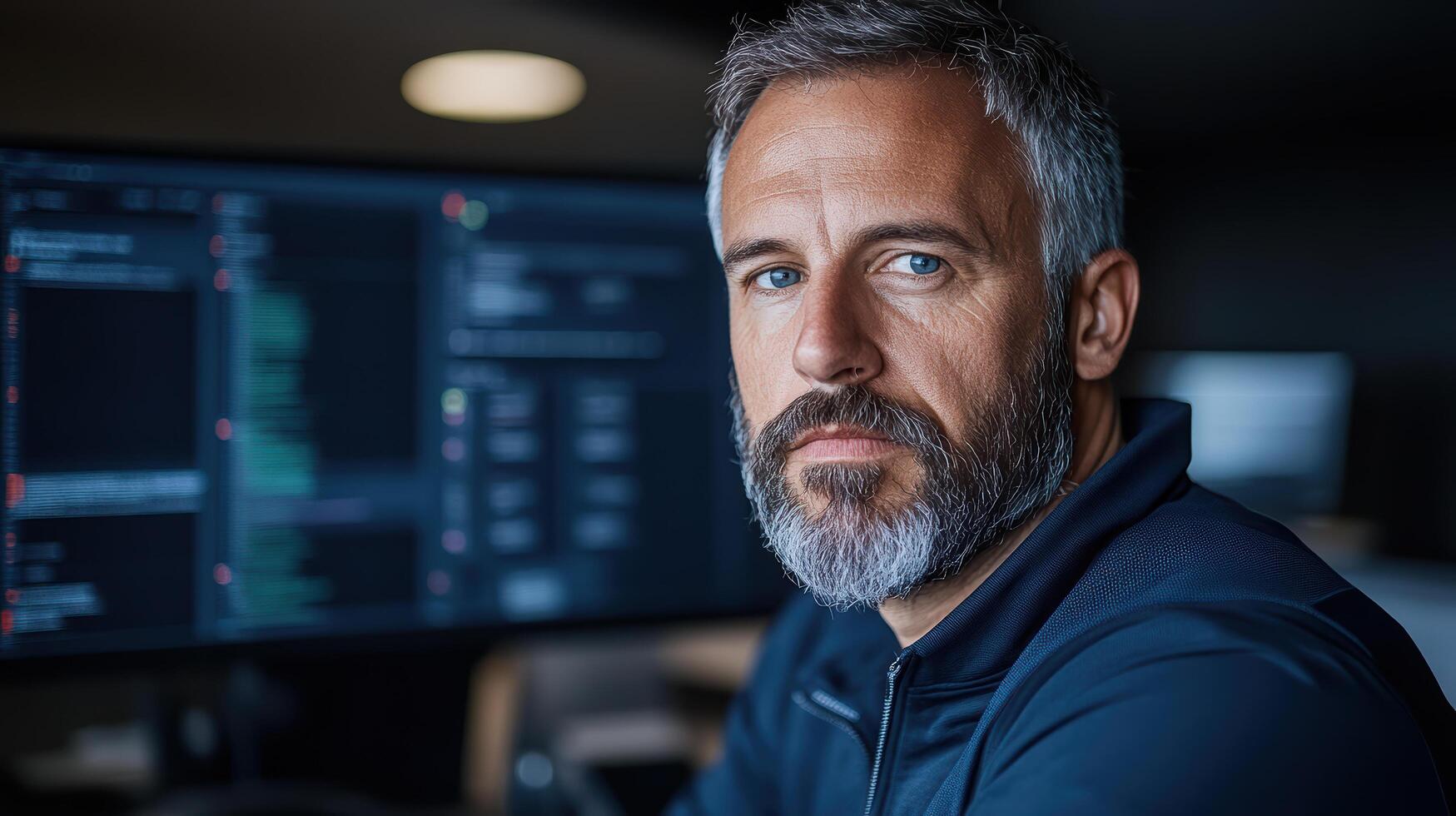focused cybersecurity expert analyzing data on multiple screens, showcasing modern workspace photo