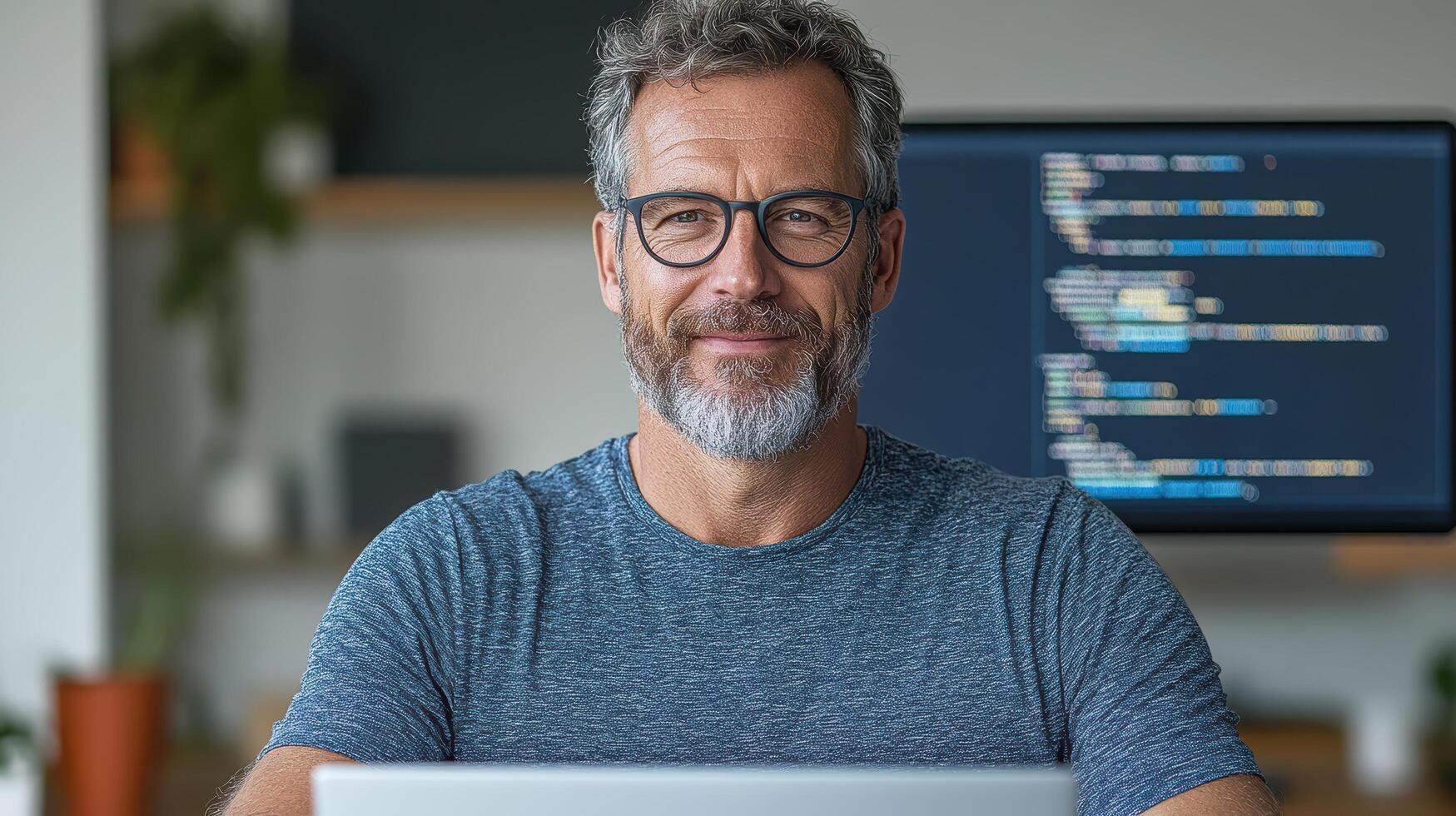 confident developer working on laptop in modern workspace, surrounded by code photo