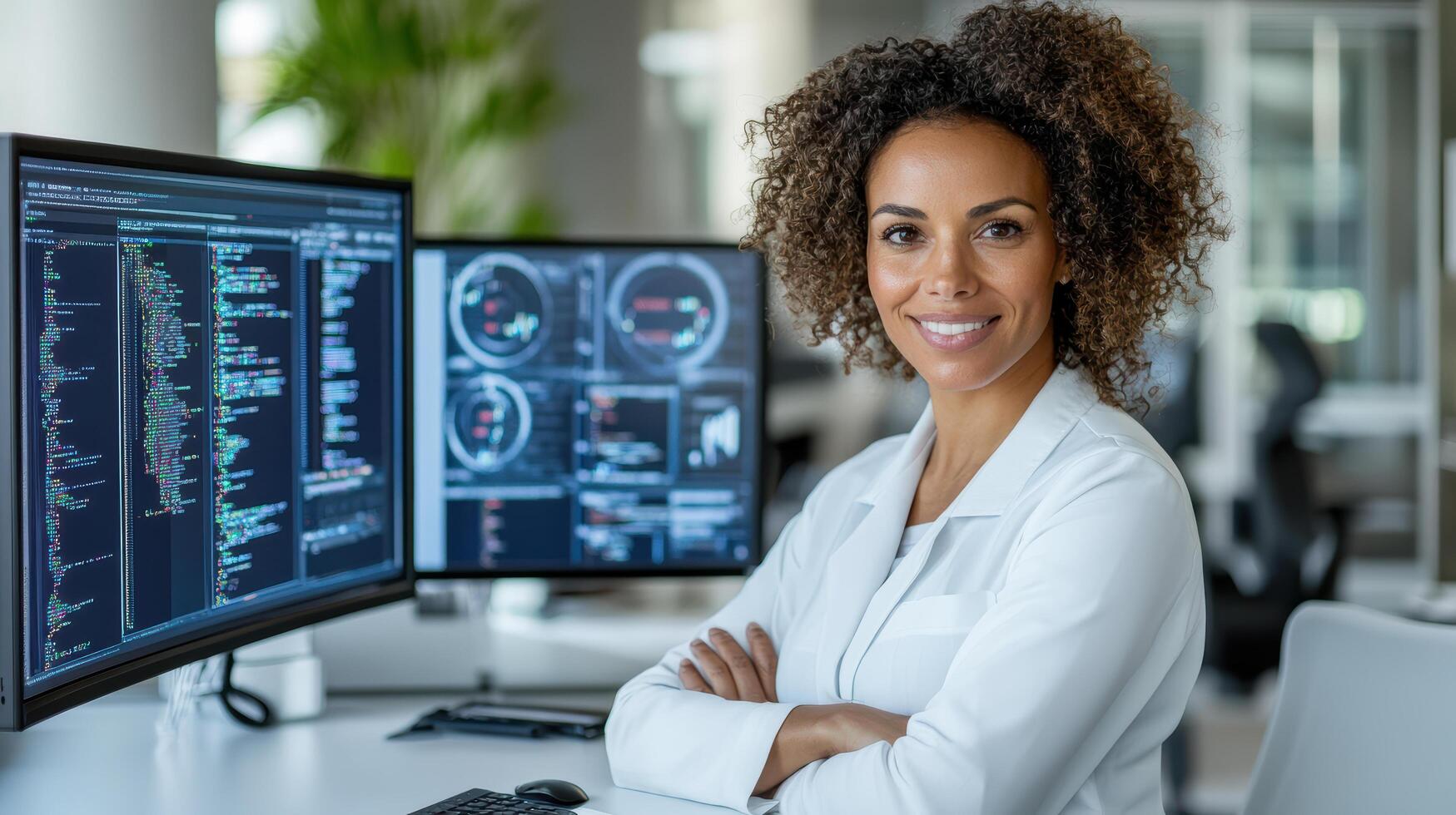 confident woman in lab coat sits in front of computer screens displaying code and data photo