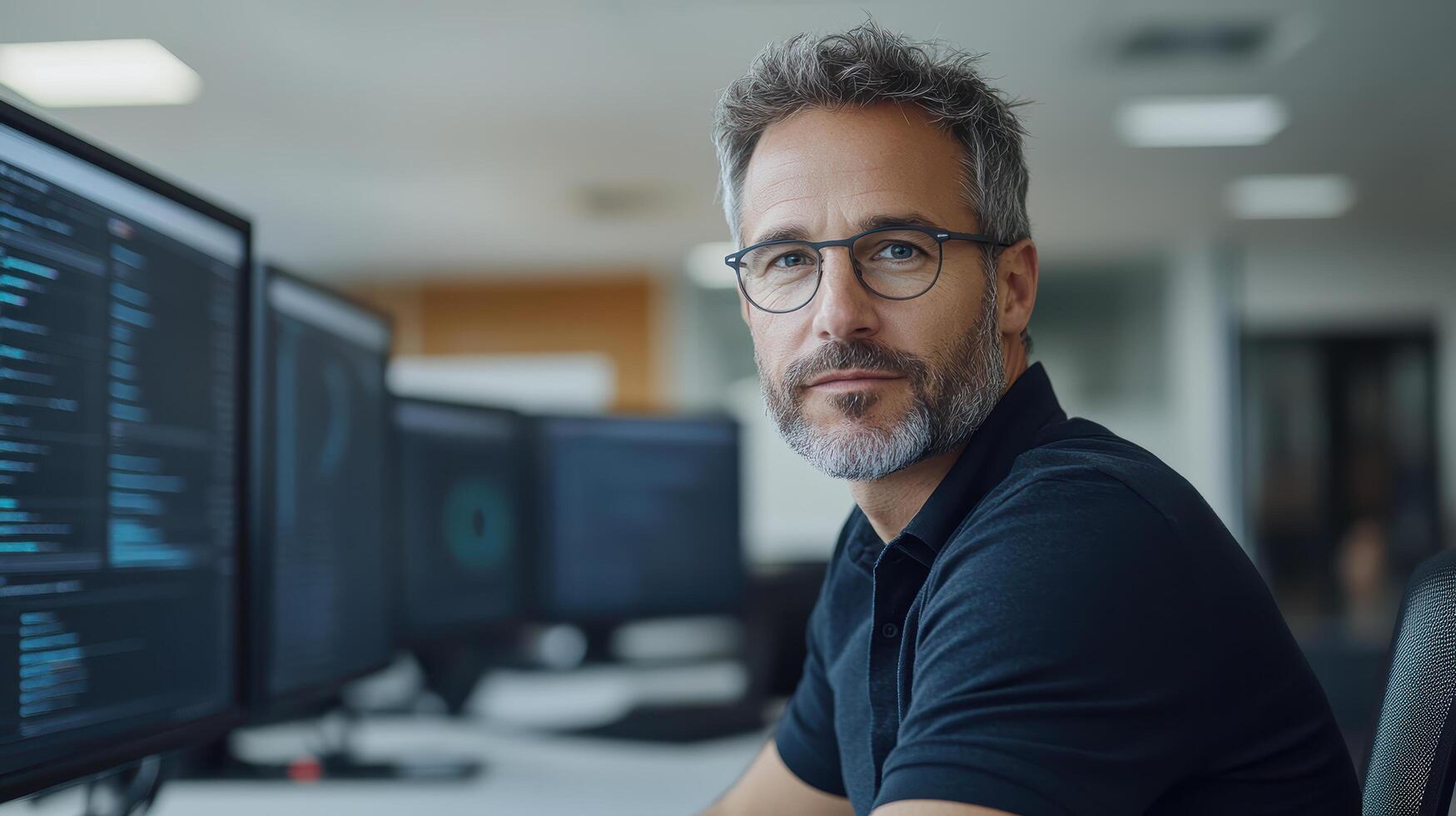 Professional man in office setting, focused on work with multiple screens displaying data photo