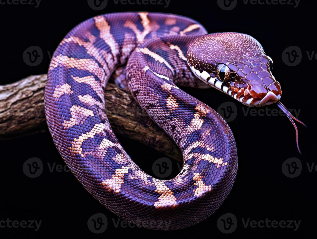 Colorful python resting on a branch in a dark setting closeup Pro Photo