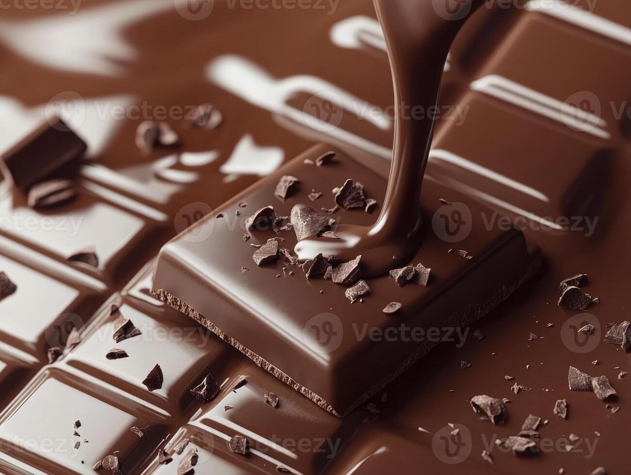 Melting chocolate pouring over bar with cocoa bits and texture Pro Photo