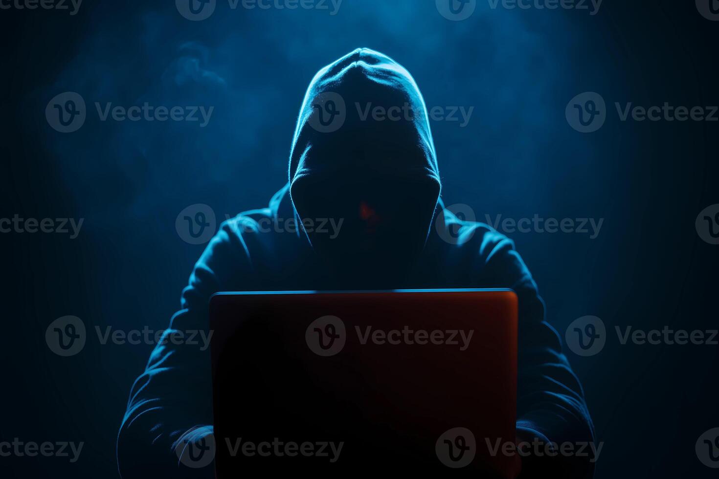 Abstract digital hacker man with a laptop. Male criminal, hoodie and ready for coding, cyber-attack and programming. Cyber hacker attack concept Pro Photo